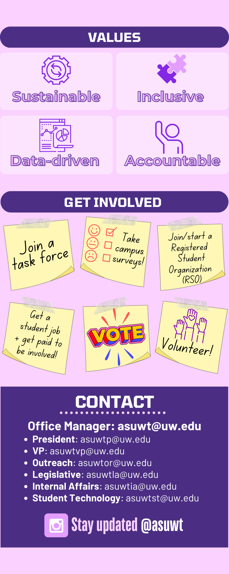 As the Director of Outreach for student government, I have been determined to advocate in the art of outreach and advertising on campus. My team and I have been working all year to ensure that college students’ needs are being met on and off campus. We have successfully registered 100+ students for our upcoming Huskies On the Hill tri-campus lobbying day in Olympia. This event brings UW students together to propose a sustainable future with opportunities to get a higher education.