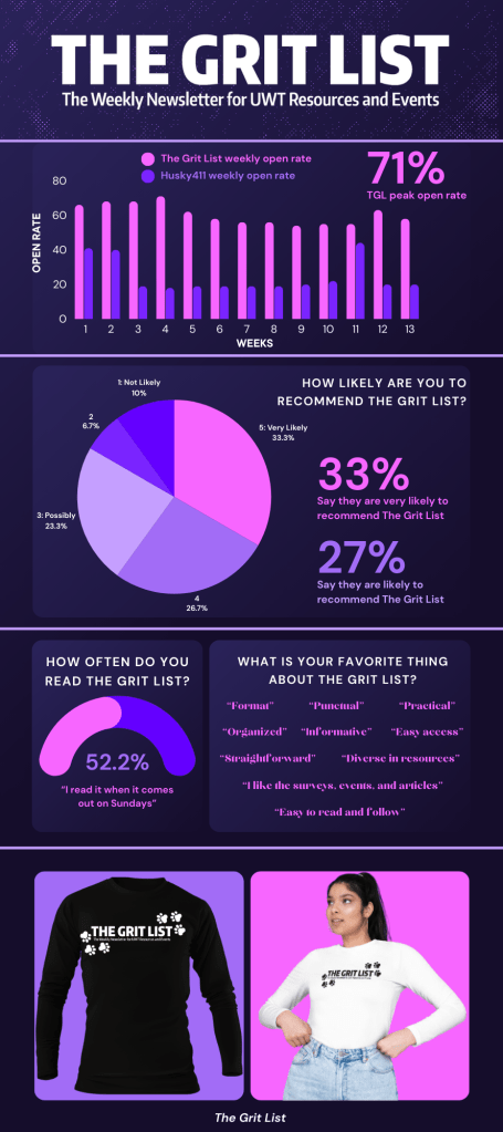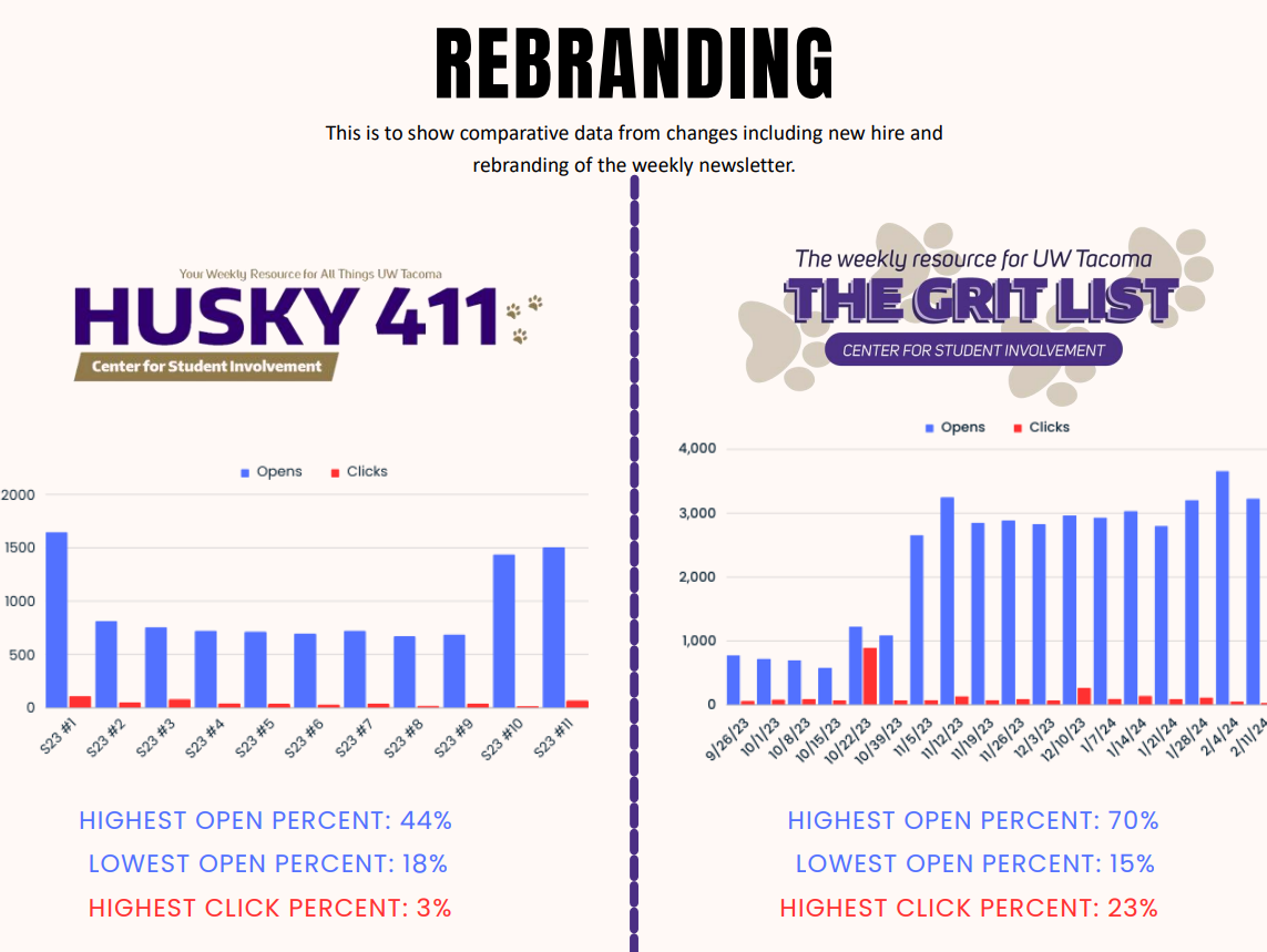Upon assuming my role, I successfully rebranded the “Husky411” newsletter to The Grit List. This transition involved utilizing Adobe Photoshop, Illustrator, and Canva for creative design purposes. Additionally, I strategically formulated plans using student data that resulted in a significant increase in our peak open rate from 44% to 70%. The average open rate also increased from 25% to 61%!